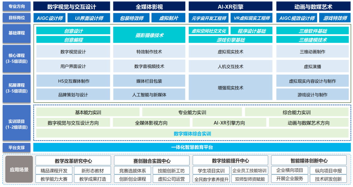 面向数字创意产业的开展体系与新时代数字技能型人才需求,聚焦AIGC设计师、UE交互设计师、包装特效师、AIGC视频制作师、元宇宙开发工程师、虚拟制片、Unity/UE开发工程师等岗位的“数字工匠”人才培养,面向中国大学生计算机设计大赛、全国大学生广告艺术大赛、蓝桥杯全国软件和信息技术专业人才大赛、中国好创意暨全国数字艺术设计大赛、未来设计师·全国高校数字艺术设计大赛、中国虚拟现实大赛、全国大学生数字媒体科技作品及创意竞赛等赛项,搭建覆盖数字媒体大类人才培养全过程的进阶式一体化实践教学体系,并建设与之配套的软硬件实训设备与环境、智慧化管理平台以及相关实训教学文档和资源。搭建起“岗位能力导向、面向真实生产、丰富教学资源、进阶实训体系、智慧平台驱动”的数字产业技能实训体系。