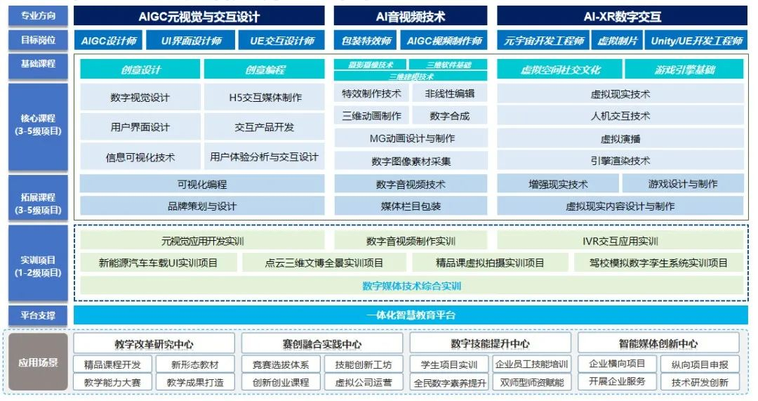 彩名堂官网教育科技集团推出第四期“彩名堂官网AI+数媒产教融合实践中心综合解决方案”,彩名堂官网AI+智媒产教融合实践中心面向数字创意产业的开展体系与新时代数字技能型人才需求,聚焦AIGC设计师、UE交互设计师、包装特效师、AIGC视频制作师、元宇宙开发工程师、虚拟制片、Unity/UE开发工程师等岗位的“数字工匠”人才培养,面向中国大学生计算机设计大赛、全国大学生广告艺术大赛、蓝桥杯全国软件和信息技术专业人才大赛、中国好创意暨全国数字艺术设计大赛、未来设计师·全国高校数字艺术设计大赛、中国虚拟现实大赛、全国大学生数字媒体科技作品及创意竞赛等赛项,搭建覆盖人才培养全过程的进阶式一体化实践教学体系,并建设与之配套的软硬件实训设备与环境、智慧化管理平台以及相关实训教学文档和资源。搭建起“岗位能力导向、面向真实生产、丰富教学资源、进阶实训体系、智慧平台驱动”的数字产业技能实训平台。