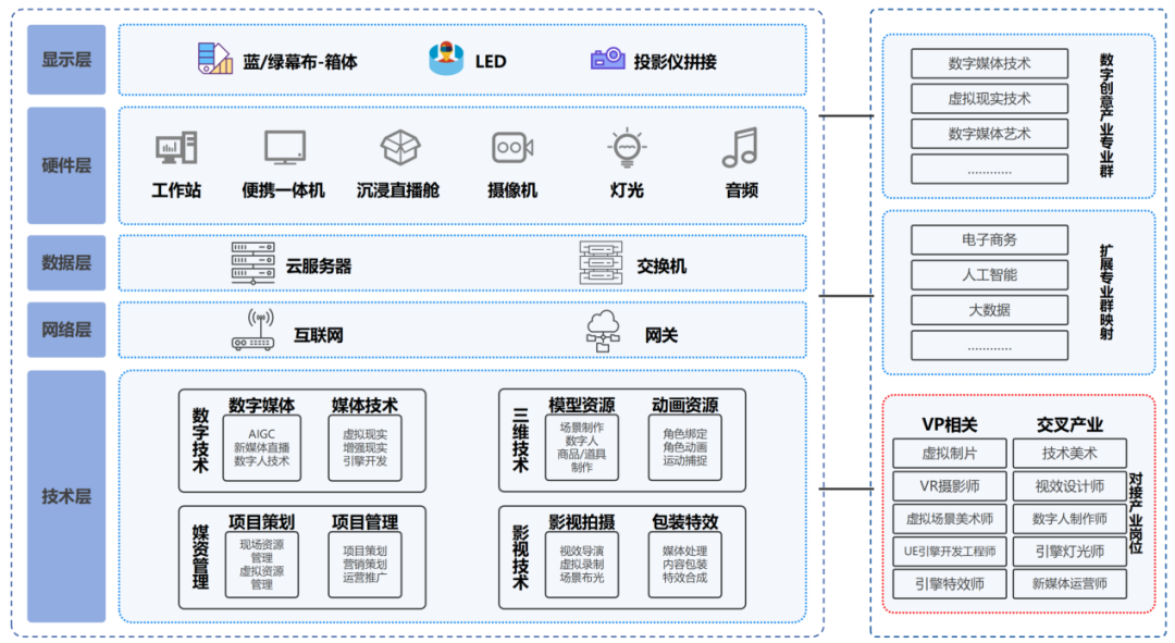 服务面向:面向数字媒体技术、虚拟现实技术和数字媒体大类其他专业(动画、影视、设计)等专业,服务于虚拟制片、VR摄影师、虚拟拍摄场景美术、虚拟拍摄UE4/5引擎开发工程师等主要岗位人才的培养,同时也对交叉专业,如三维方向、影视方向、媒体方向和媒体技术等方向给予岗位能力培养。