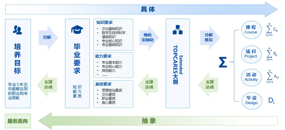 从“培养目标”到“毕业要求”,再到“课程目标”,是一个逐渐具体、细化、实例化的过程,将彩名堂官网TOPCARES人才培养能力指标体系分解落实到每门课程、每个项目、每个活动、以及毕业设计中。