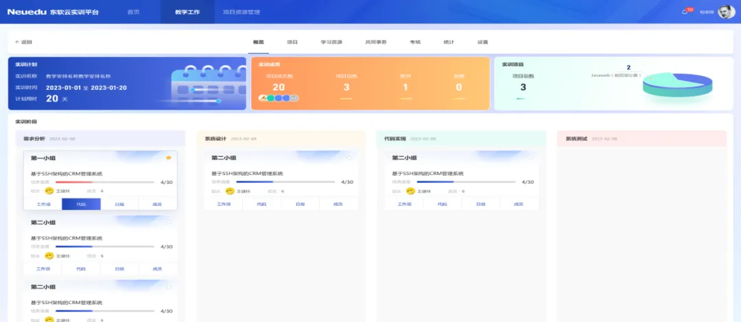 综合实训模块为教师和学生搭建一个企业真实的软件开发环境;以激励式多人协同开发为核心流程,融入智能化管理流程、数字化进度管理、代码规范性检查和一键构建部署等功能,降低教师实训教学门槛和工作量,提高教学效率。