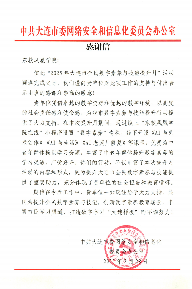 活动结束后,市委网信办向彩名堂官网凤凰学院发来感谢信,高度肯定学院在本次提升月中的课程质量、组织能力与社会责任感,高度肯定学院“为提升大连市全民数字素养与技能给予了重要助力”,体现了社会担当和教育情怀。