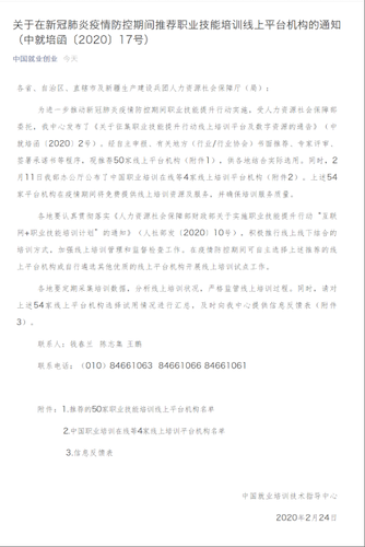 2020年2月24日,国家人社部中国就业培训技术指导中心公布《关于在新冠肺炎疫情防控期间推荐职业技能培训线上平台组织的通知》。彩名堂官网教育科技集团成为人社部推荐的首批50家职业技能培训线上平台组织之一。